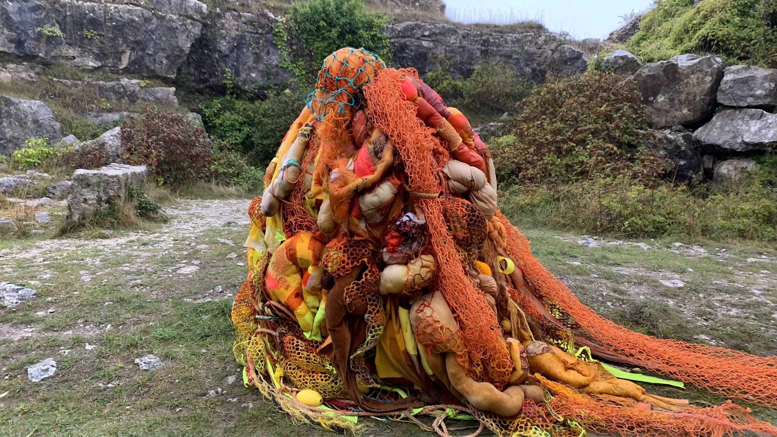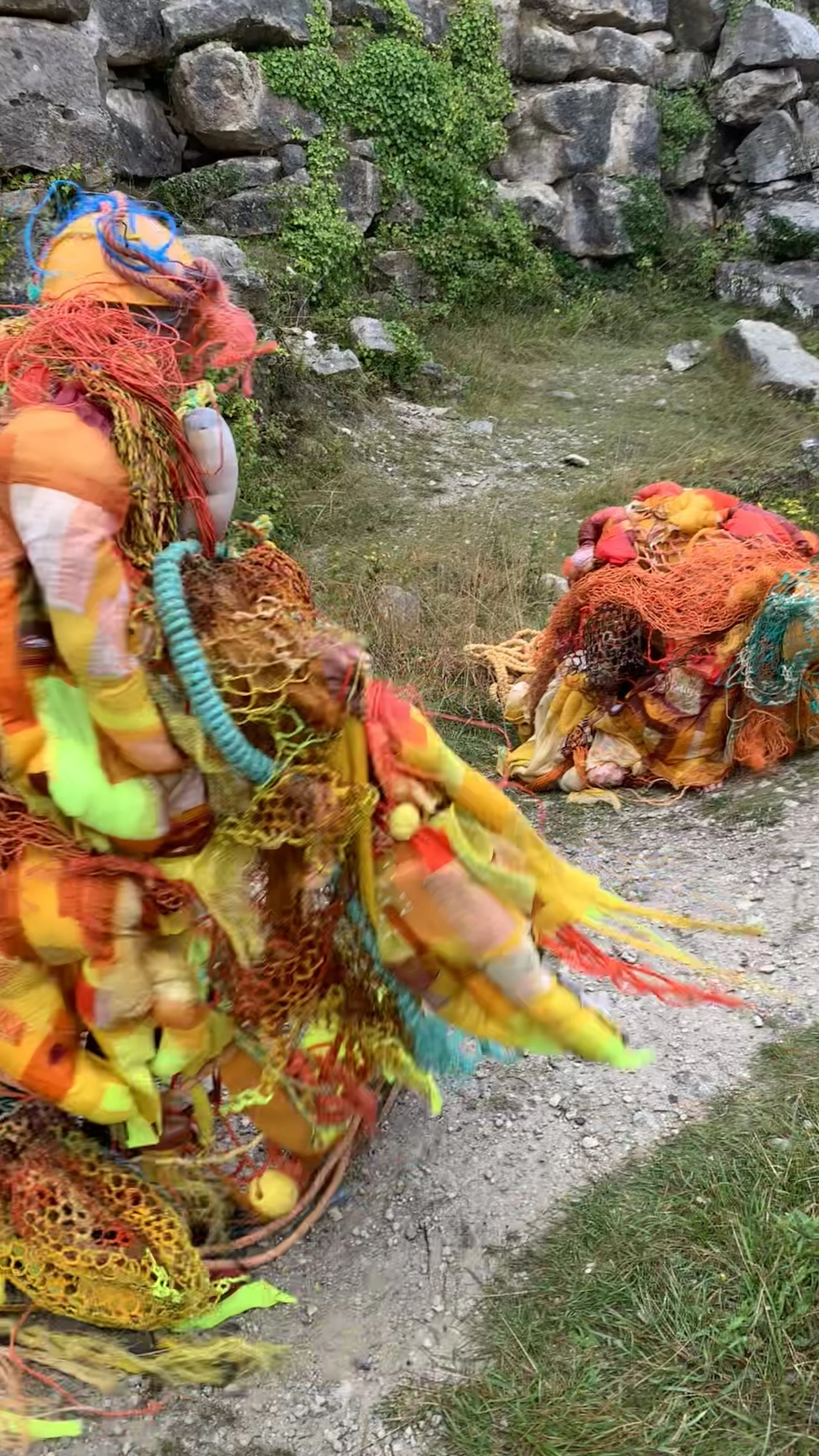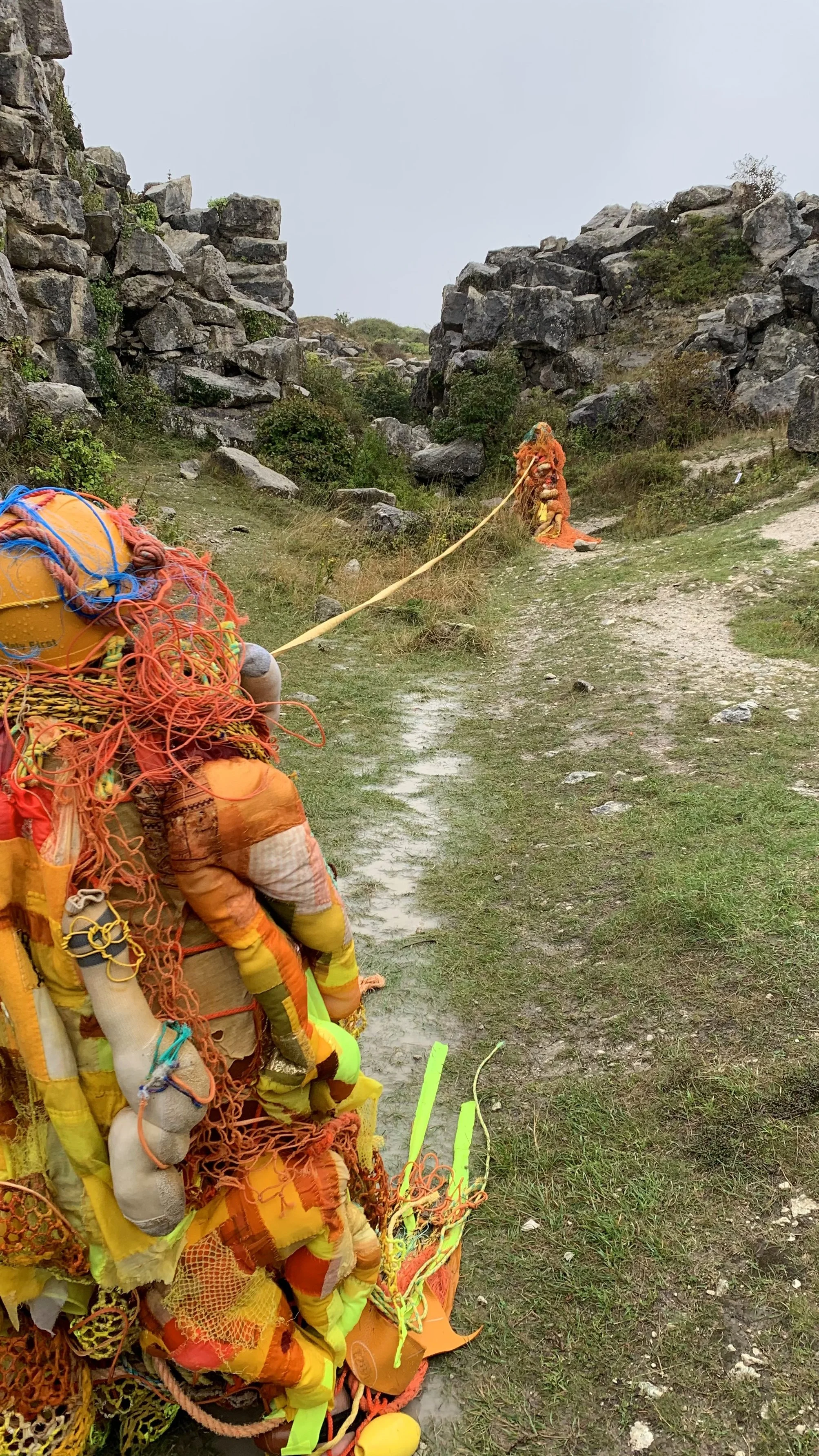 Riot Performance, 14 September, with me and Melanie Thompson: Found, recycled & donated materials: beach waste (ghost netting, rope, hard hats, fishing floats), wire, textiles (some home-dyed with natural pigments), wool, twine, plastic, sponge, polyester, natural debris, sandbags. Photos by Andy Ralston