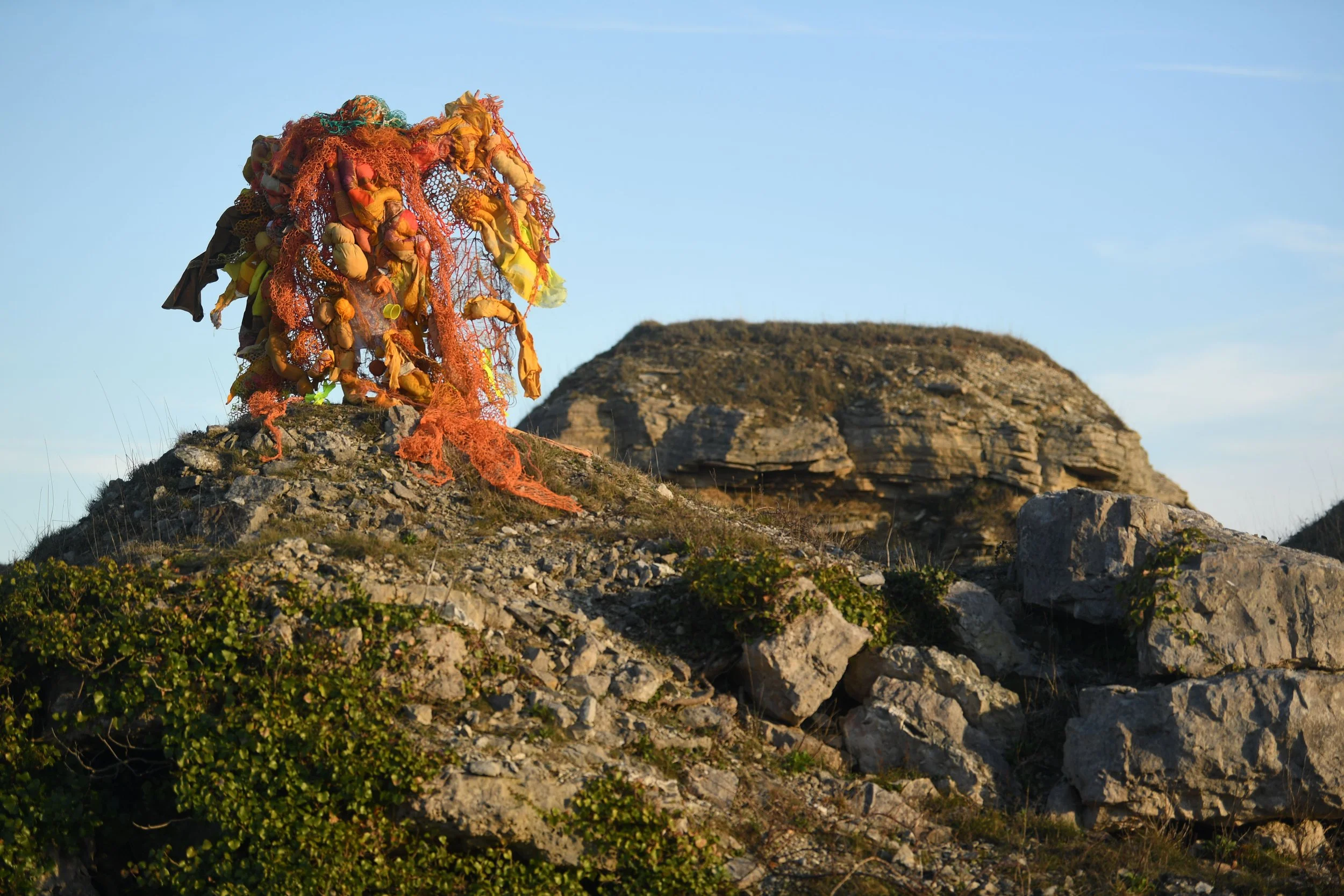 Found, recycled and donated materials: beach waste (ghost netting, rope, hard hats, fishing floats), wire, textiles (some home-dyed with natural pigments), wool, twine, plastic, sponge, polyester, natural debris, sandbags